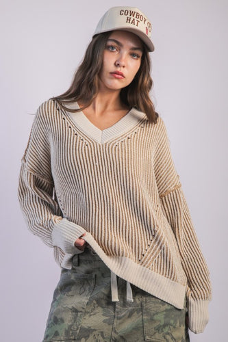 DENVER- Cream & Beige Chunky two tone Vneck sweater top