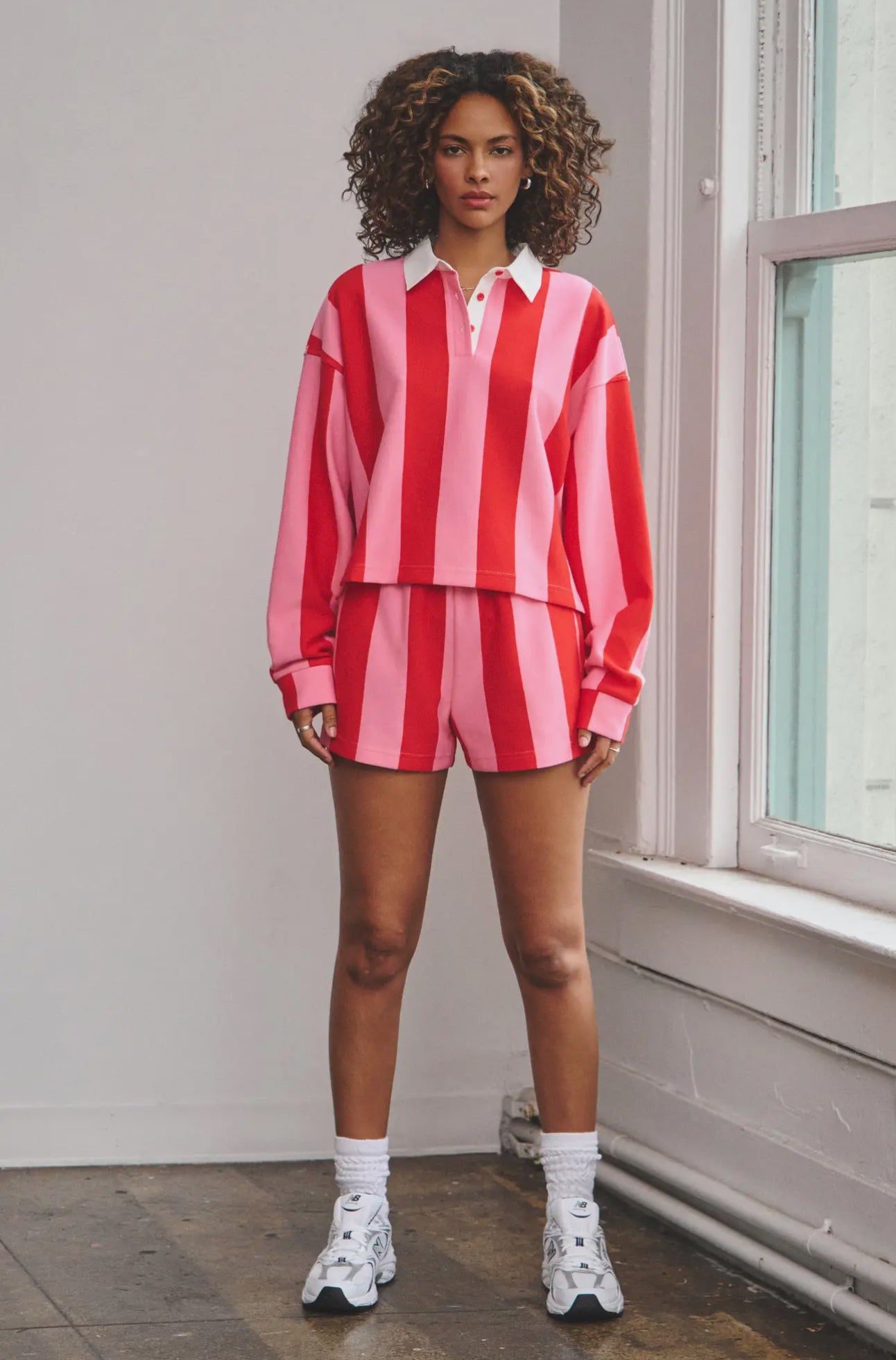 - Vertical striped crop rugby top and shorts set - French terry material - Two tone stripe detail - White collar button down detail - Loose fit - Cropped length - Striped shorts with elsatic waistband - Front side pockets - Good stretch - Model size 5' 8" ( Wearing S size)
