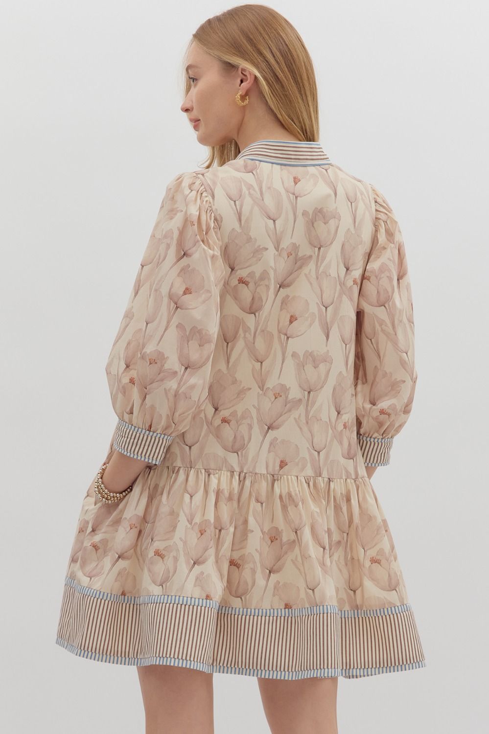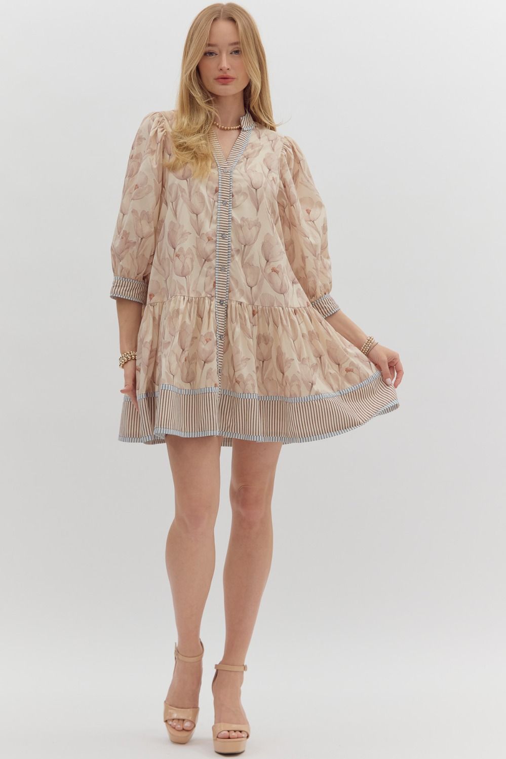 FLORAL PATH-Ecru muted floral print ruffle hem dress