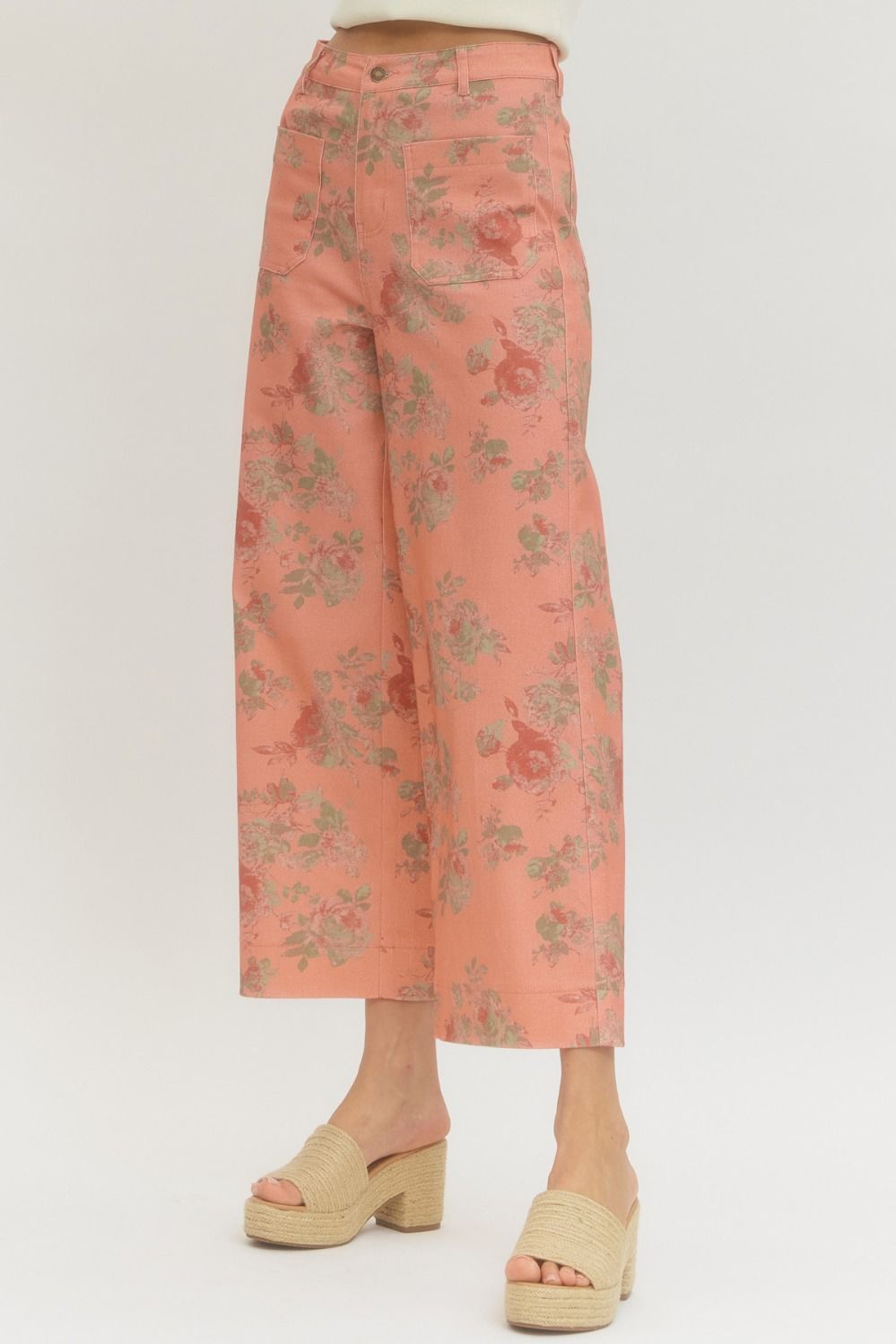 Floral print pants featuring zip-fly button front closure. Front pockets. Back patch pockets.