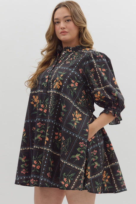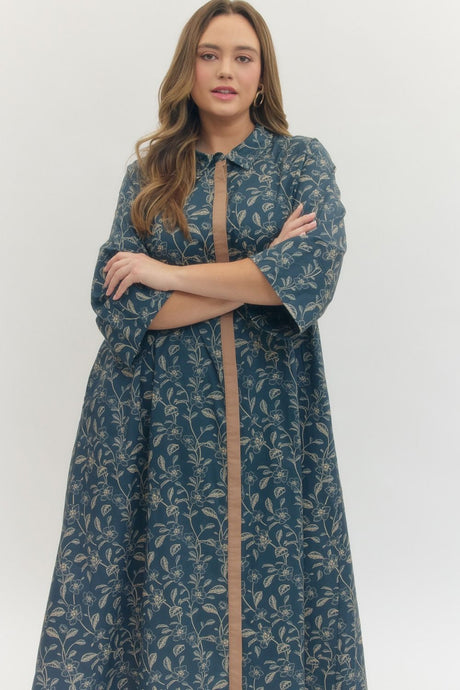 • Plus Floral Elegance- Floral pattern contrast hem button down dress