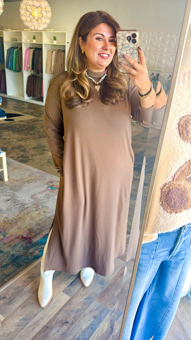 • Plus Melanie- Luxe Ribbed Chocolate brown light mock neck midi dress