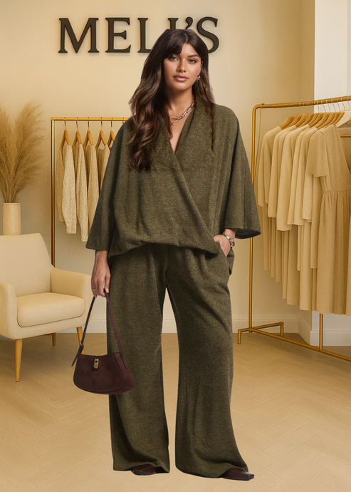 Plus Melisa- Olive Elegant ribbed two piece wide leg pants set
