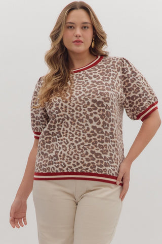 Plus NALA- Leopard puff sleeve contrast collared top
