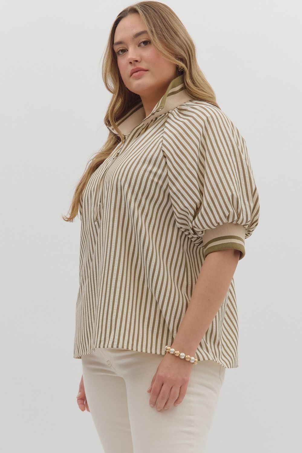 Plus Belle- Olive Stripe pattern half-zip closure short puff sleeve top