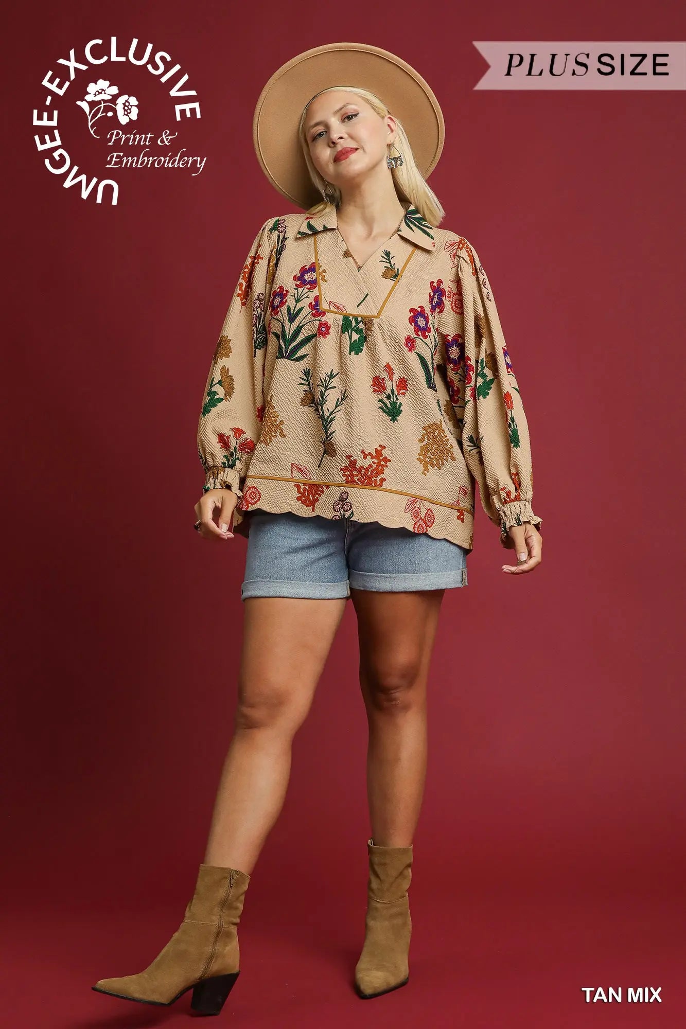 Plus Floral patch- UMGEE exclusive textured long sleeve collared top