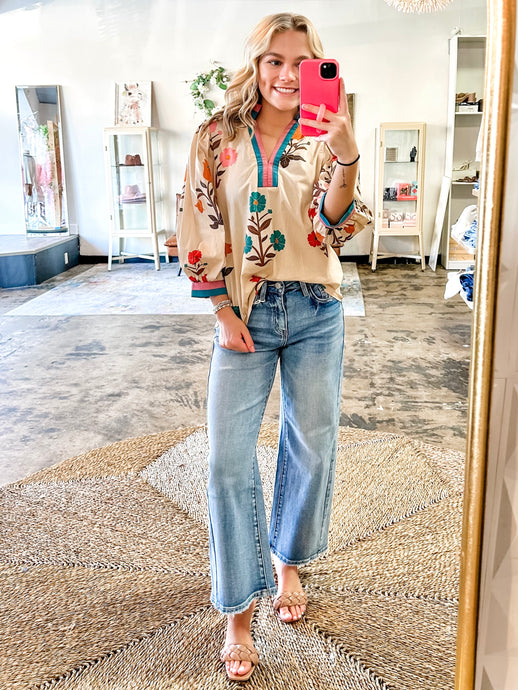Botanical Garden- Ecru Floral print short bubble sleeve top
