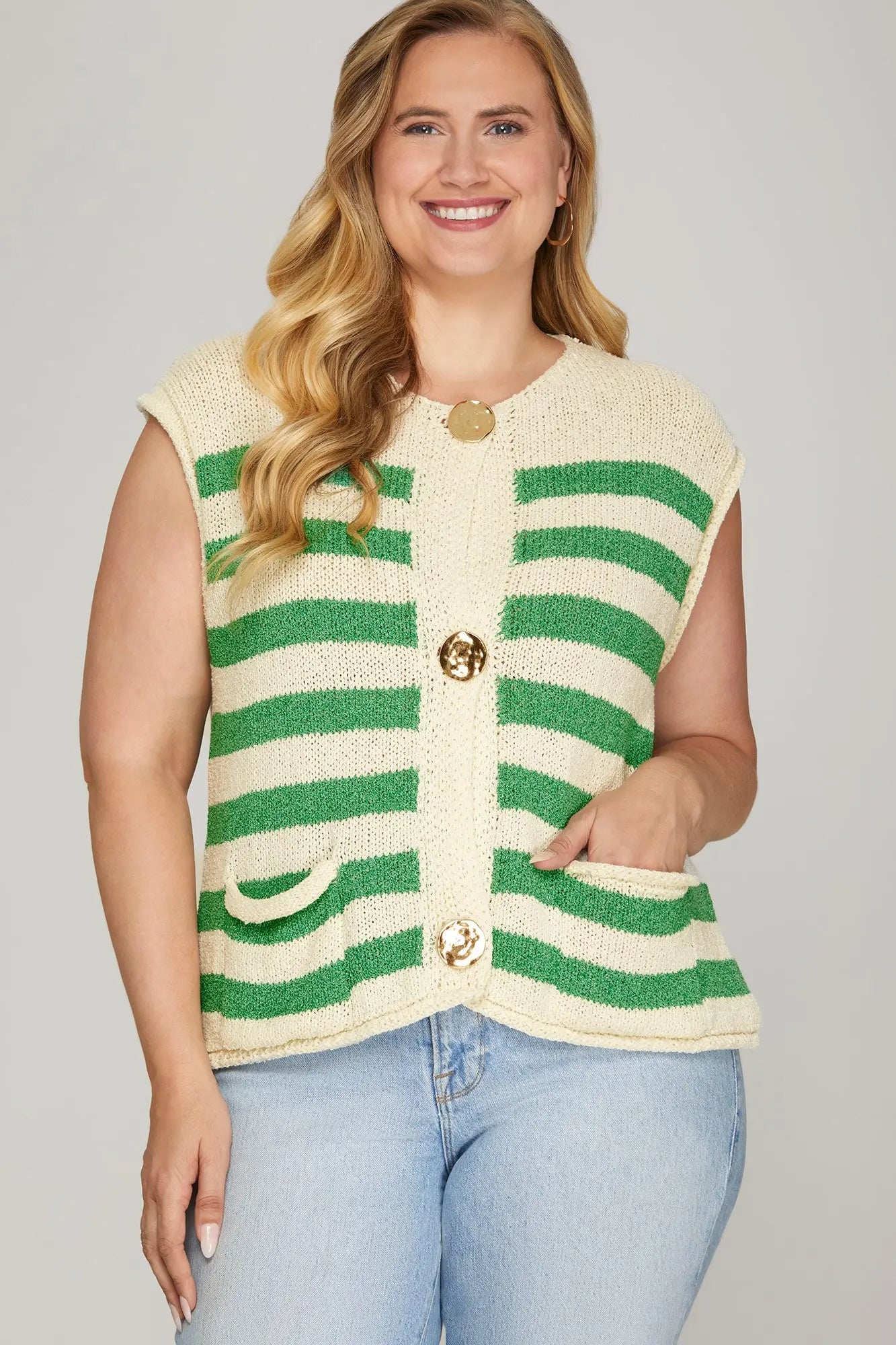 Curvy sized Lara- Boxy Kelly green striped sweater vest